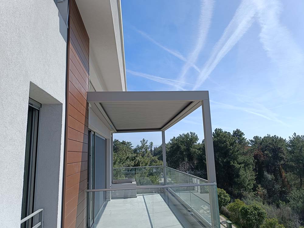 Πραγματοποιήσαμε την τοποθέτηση σύγχρονων κουφωμάτων υψηλής ενεργειακής απόδοσης, προσφέροντας εξαιρετική θερμομόνωση και ηχομόνωση, με υλικά που αντέχουν στον χρόνο και ενσωματώνονται αρμονικά στην αρχιτεκτονική του κτιρίου. Ιδιαίτερη έμφαση δόθηκε στη βιοκλιματική πέργκολα που τοποθετήθηκε στον τελευταίο όροφο: με ρυθμιζόμενα φύλλα που ανοίγουν και κλείνουν, προσφέρει σκίαση, προστασία και φυσικό δροσισμό, προσαρμόζοντας τον χώρο ανάλογα με τις καιρικές συνθήκες και τις ανάγκες των ενοίκων.
